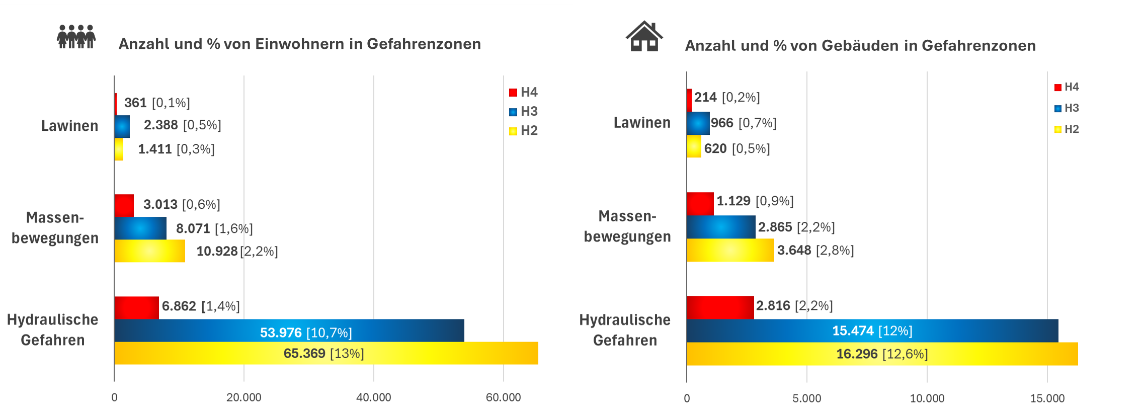 Die Analyse zeigt, dass Wassergefahren vor Massenbewegungen und Lawinen das größte Risiko für Bewohner und Gebäude in Gefahrenzonen darstellen.