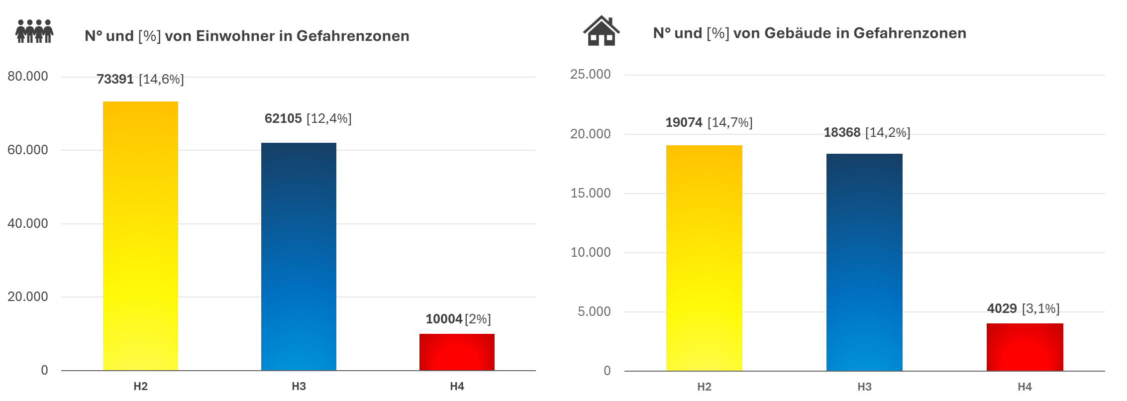 Anzahl und [%] der Einwohner und Gebäude nach Gefährdungsstufe