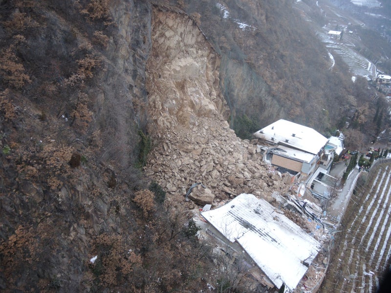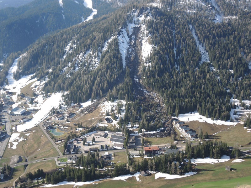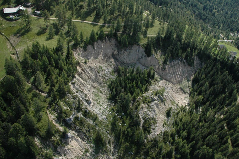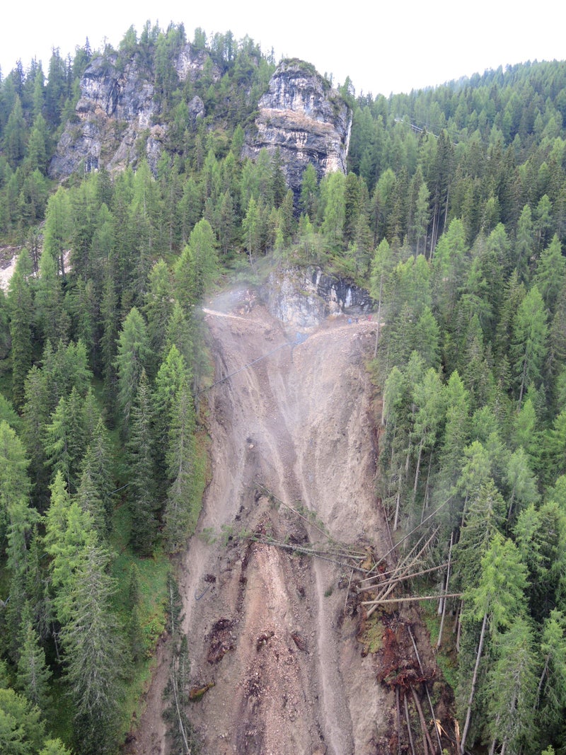 Massenbewegungen bedrohen oft Siedlungen (wie im Fall des Fotos, das sich 2009 in St. Leonhard im Passeier ereignete) oder Infrastrukturen, und können große Schäden verursachen.