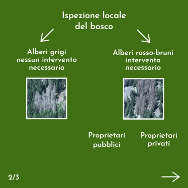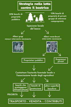 La Forestale non fa “tagli preventivi” di piante sane che potrebbero essere attaccate dal bostrico in futuro. Una misura del genere non ha senso, poiché non è possibile anticipare il comportamento dei coleotteri. Inoltre, la rimozione di alberi sani non rallenta in alcun modo l'attacco di altri alberi.