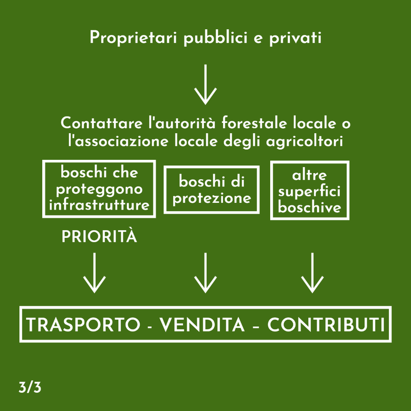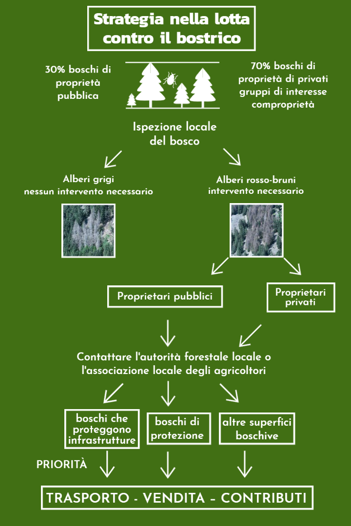 Bisogna fare ogni sforzo per lasciare in bosco meno substrato colonizzabile possibile. Piante schiantate dal vento o dalla neve, così come le piante bostricate, anche quando si tratti di singoli esemplari, devono essere lavorate e rimosse dalla foresta il più rapidamente possibile.